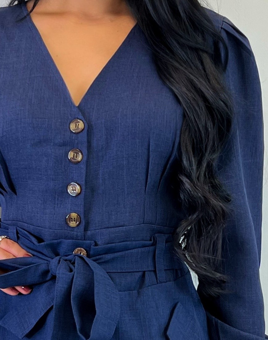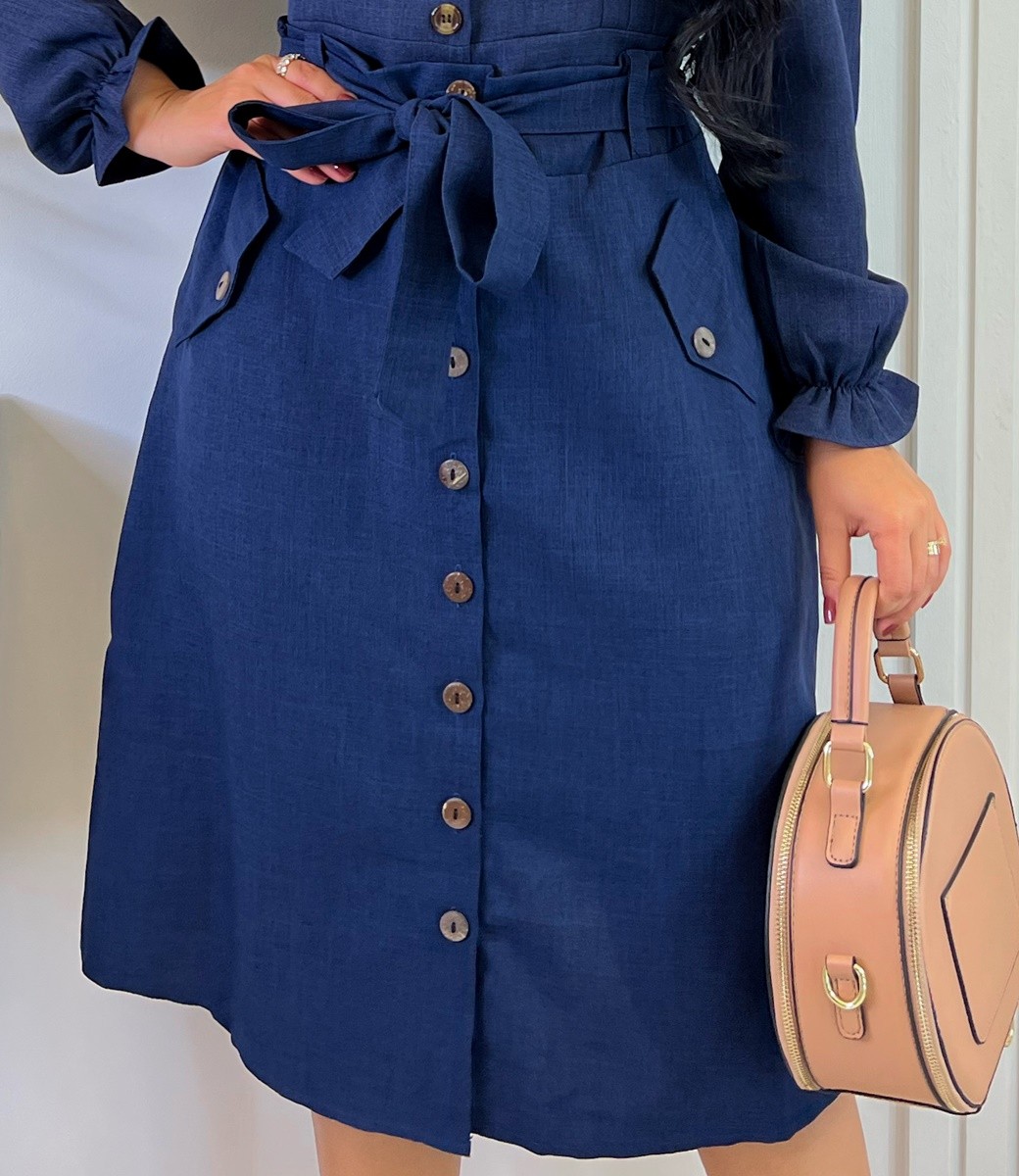 Saia modelagem evasê botões frontais e lapela nas laterais.