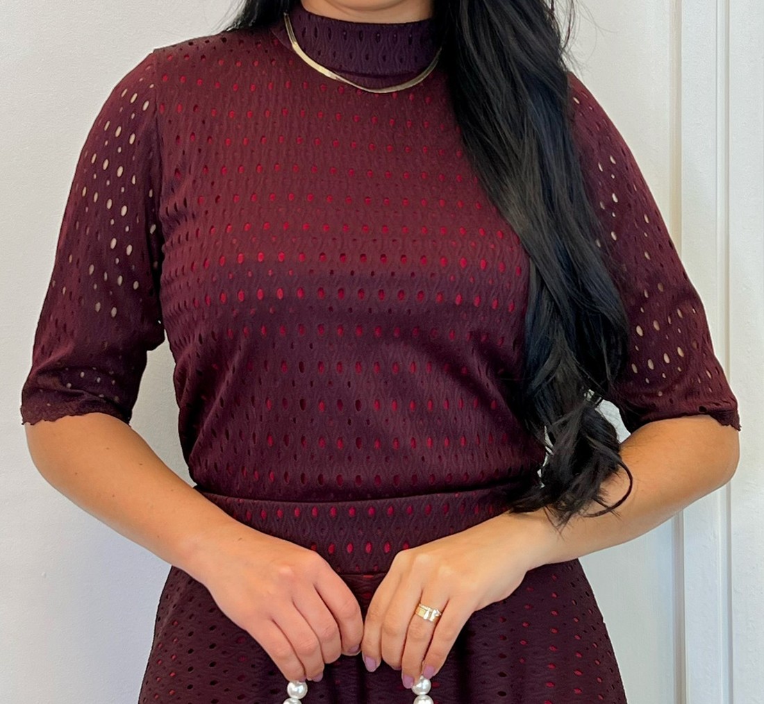 Blusa com a gola um pouco mais alta, com manga vazada, forrada, exceto nas mangas.
