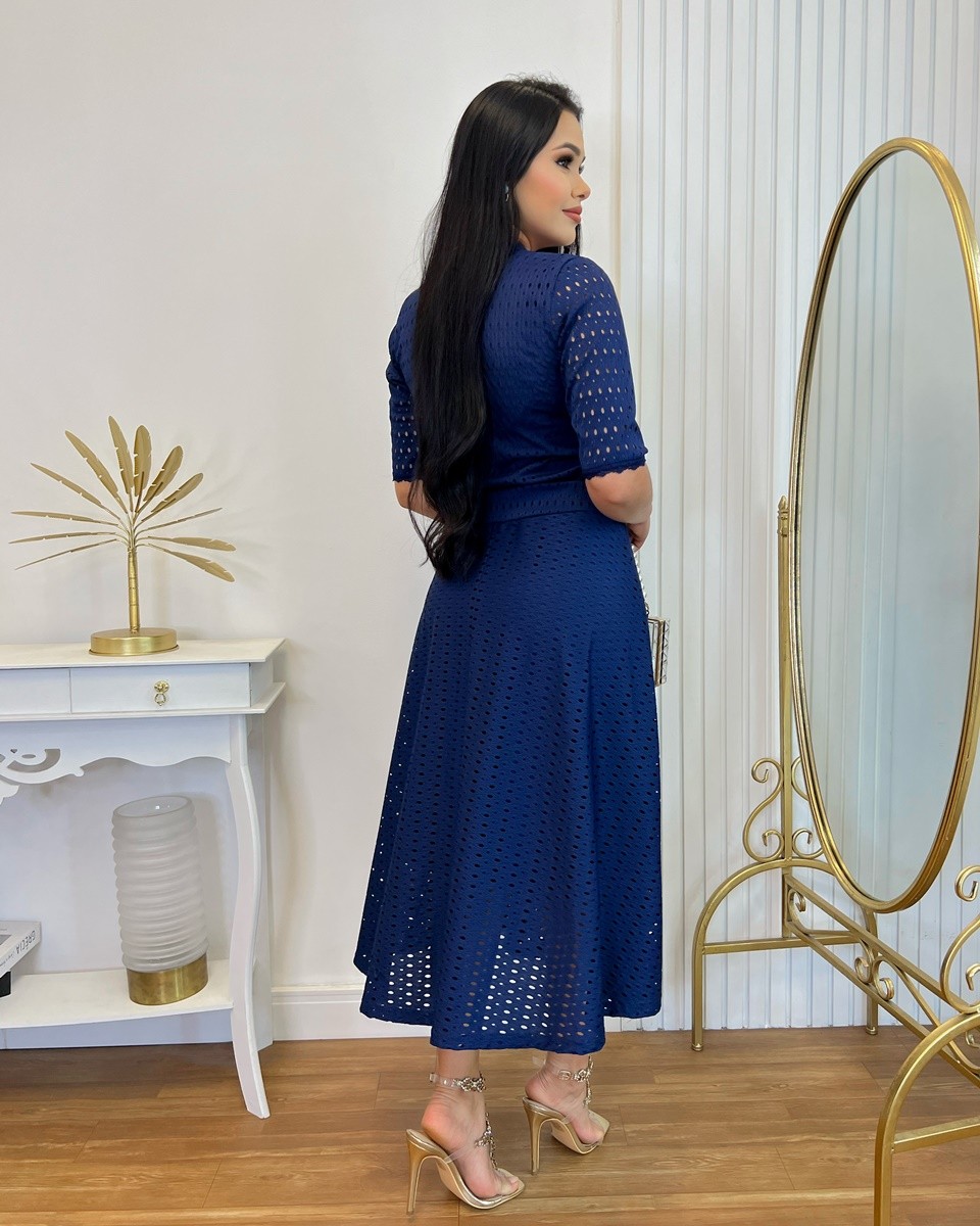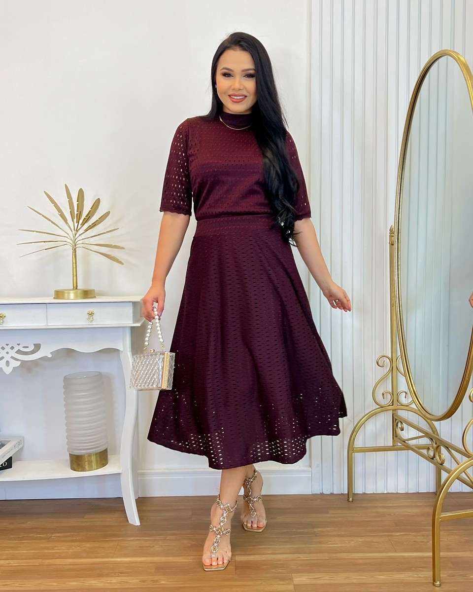 Saia midi, modelagem evasê, no tecido malha de lese, possui elástico largo no cós.