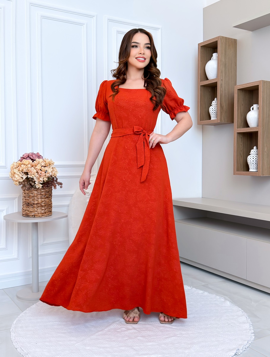 Vestido longo no tecido duna texturizado com elastano, possui modelagem evasê.