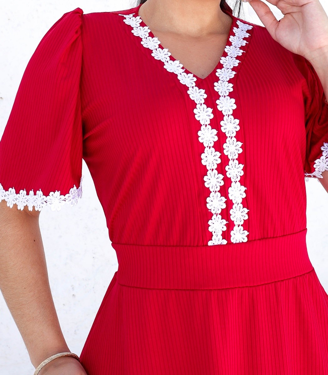 Possui um lindo acabamento em renda guipir na gola e nas mangas flare