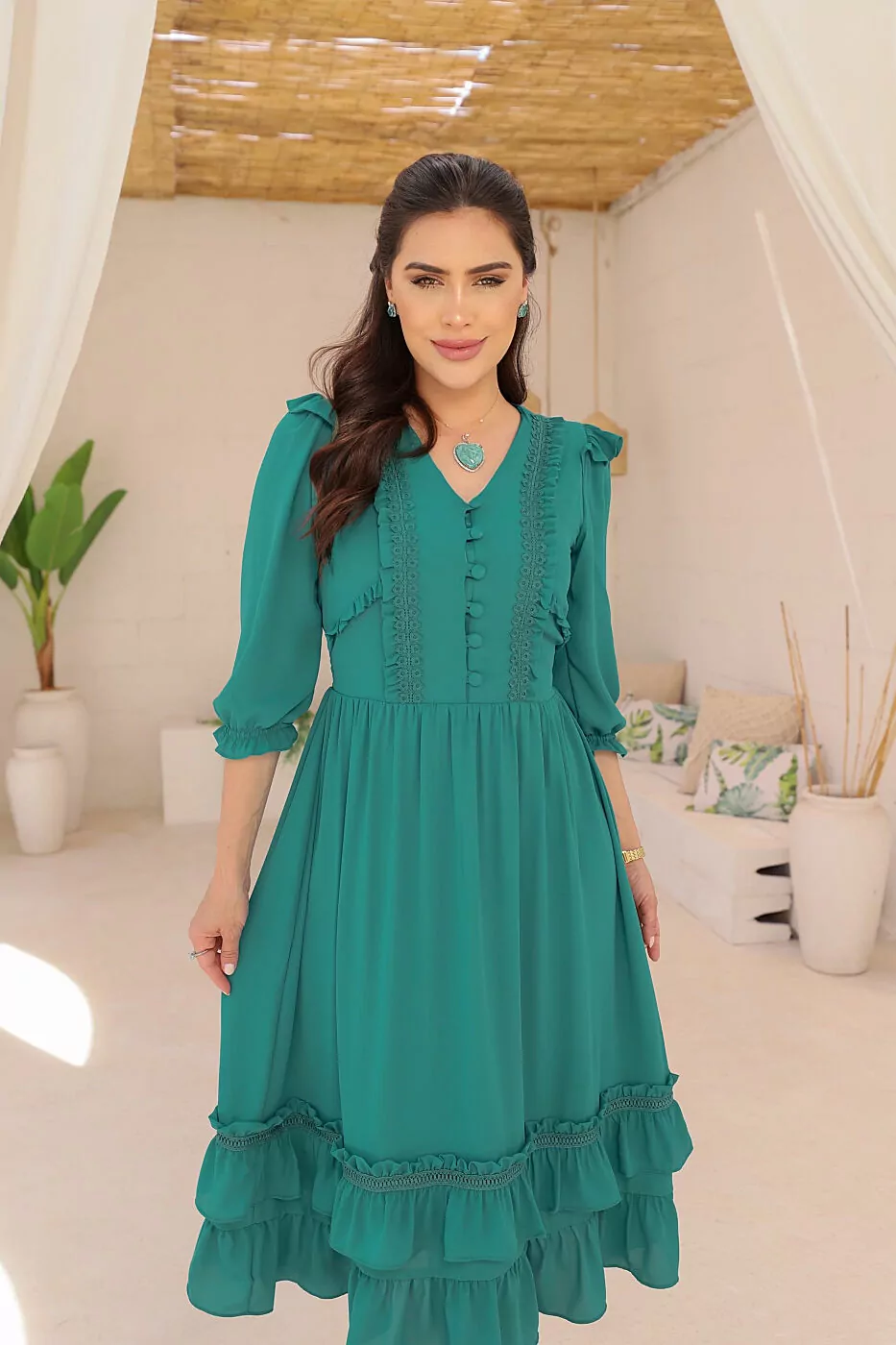 Vestido midi no crepe premium, decote V com botões encapados funcionais e renda guipir. Possui detalhes em babados no busto e cintura, manga 3/4 com lastex que permite regular.