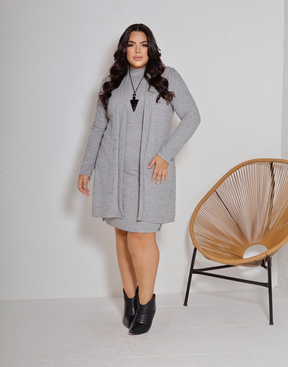 Cardigan liso manga longa em lãzinha, o mesmo tecido do vestido.